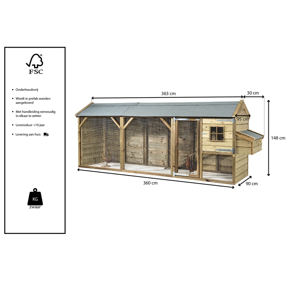 De kippenren heeft een buitenmaat van ongeveer 360 x 90 cm en is volledig overdekt met een dak dat is afgewerkt met sterk dakleer. Hierdoor blijft de ren droog, is het verblijf makkelijker schoon te houden en kunnen je kippen het hele jaar door lekker buiten scharrelen.