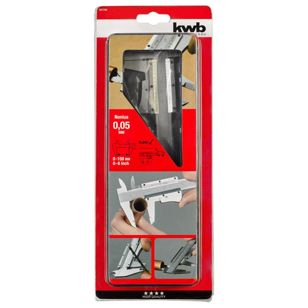 Schuifmaat volgens DIN 862, voor het precies meten van buitenkanten, binnenkanten en diepten, kruisvormige kop voor binnenmeting, vlakke dieptemeetstaaf, schuifmaat van rvs, mat verchroomd, aanduiding in millimeter en inch, nonius 0,05 mm, tabel met ISO-metrische schroefdraad op de achterkant, geleverd in een handige kunststof opbergbox.