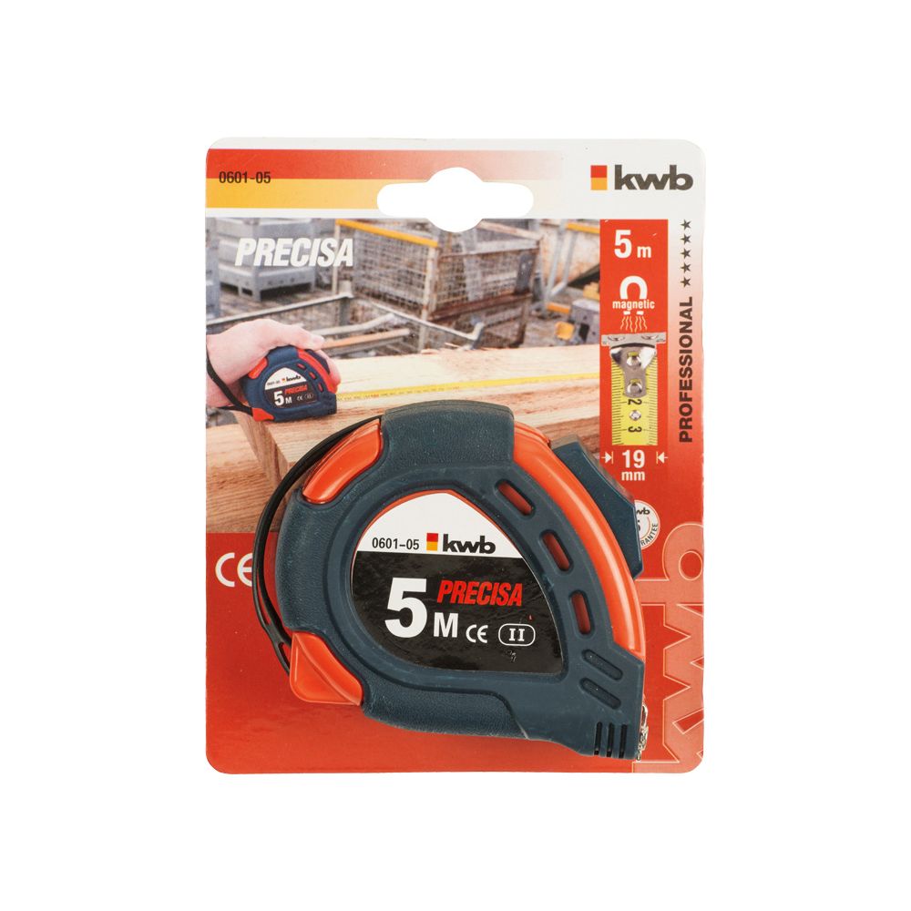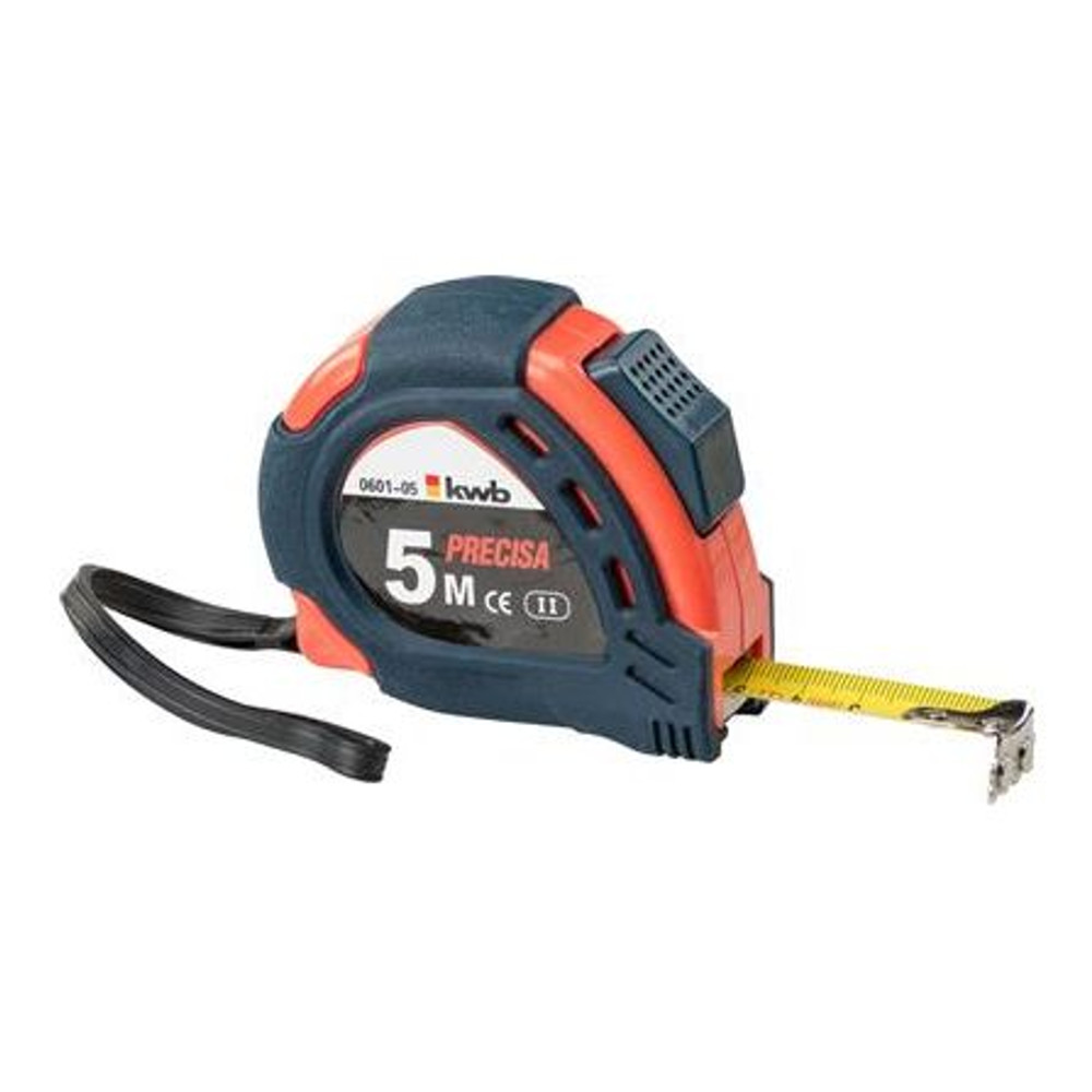 Stalen meetband, gebombeerd (gewelfde band), gehard, met speciale haak voor binnen- en buitenmeting, haak voorzien van sterke magneten, rolt automatisch op na de vrijgave van de band, behuizing van ABS-kunststof, breekvast, automatische bandvergrendeling, met EG-modelgoedkeuring, nauwkeurigheidsklasse II.
