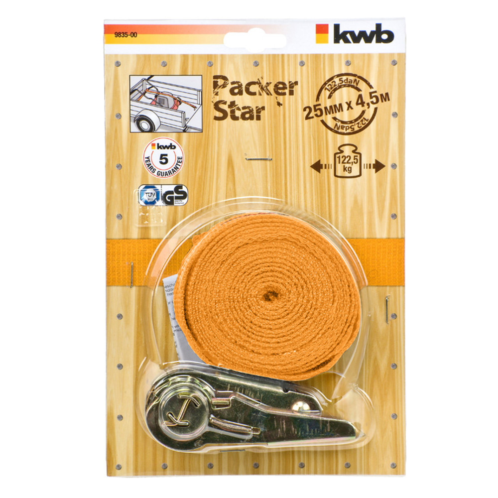 Sjorband met ratel, 4,5 m x 25 mm, 245 daN (kg), polypropyleen (PP), zeer sterk, voor het vastsjorren en bevestigen van ladingen op of in personenauto’s, bestelauto’s en akkoffers