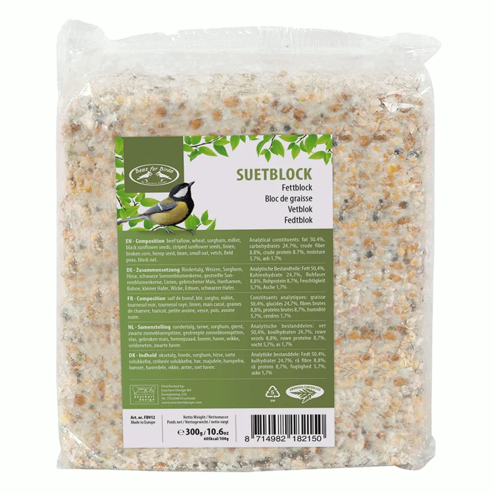 Het Wildbird vetblok is een energierijke traktatie voor een grote varieteit vogels. Door de optimale vethardheid kan dit zadenvetblok het hele jaar door worden aangeboden en is een goede opname gegarandeerd. Het Wildbird Vetblok is verkrijgbaar in diverse smaken: Bosvrucht, zaden, zonnebloem en pinda. Plaats het vetblok in een vetblokhouder.
