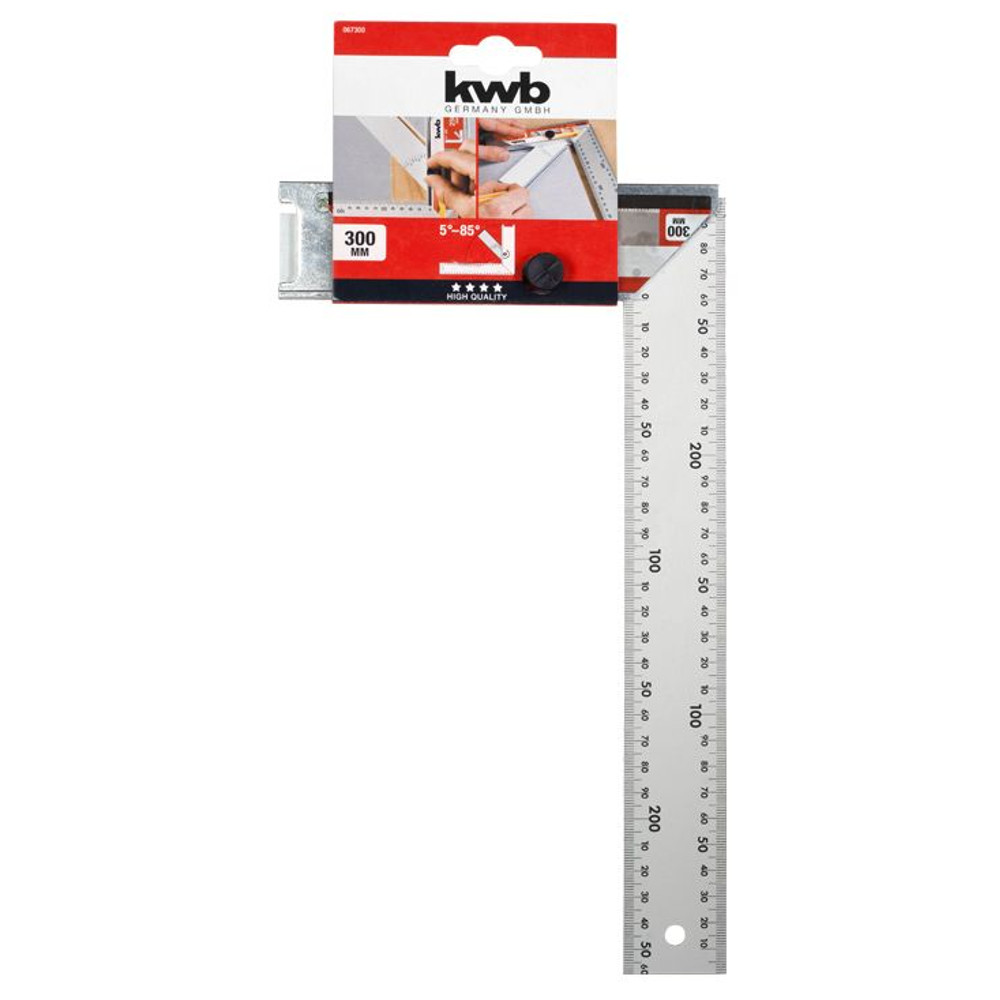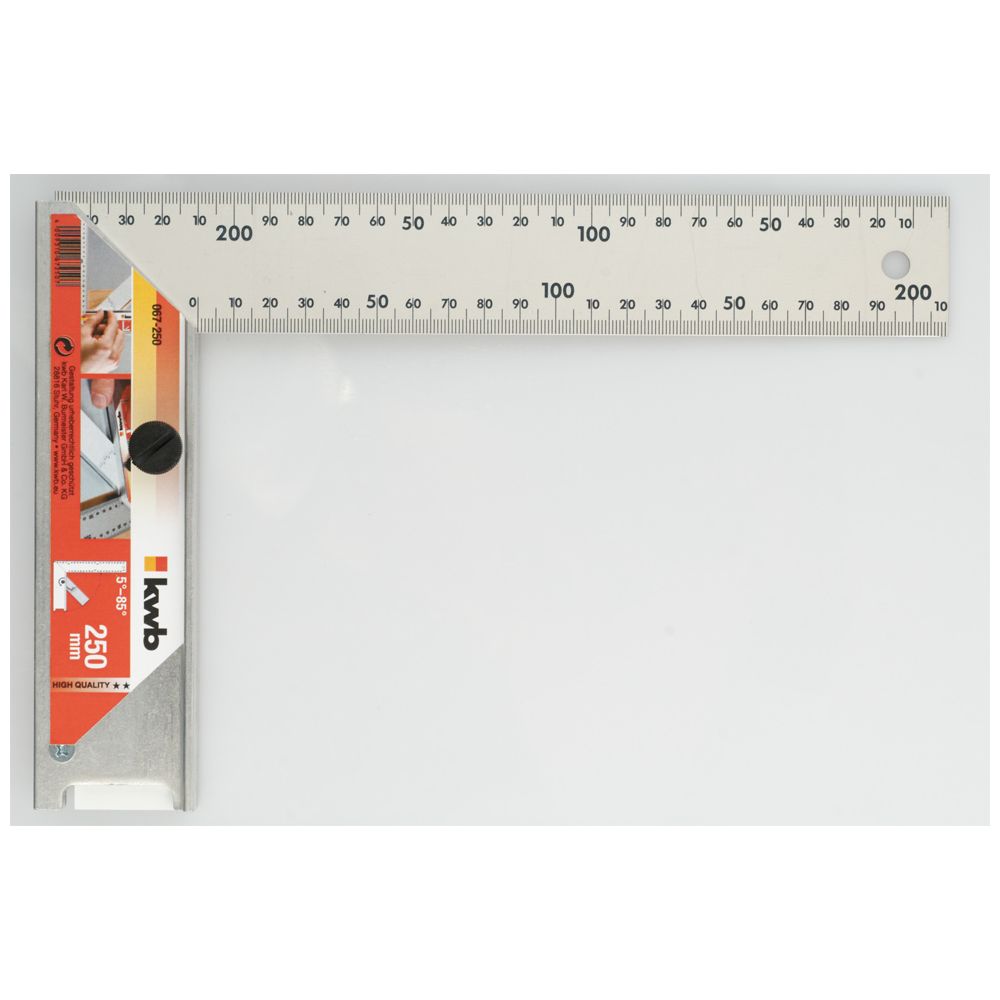 Winkelhaak met aanslag, traploos verstelbare meettong, vergrendelbaar, 2-voudige schaal, geanodiseerd.